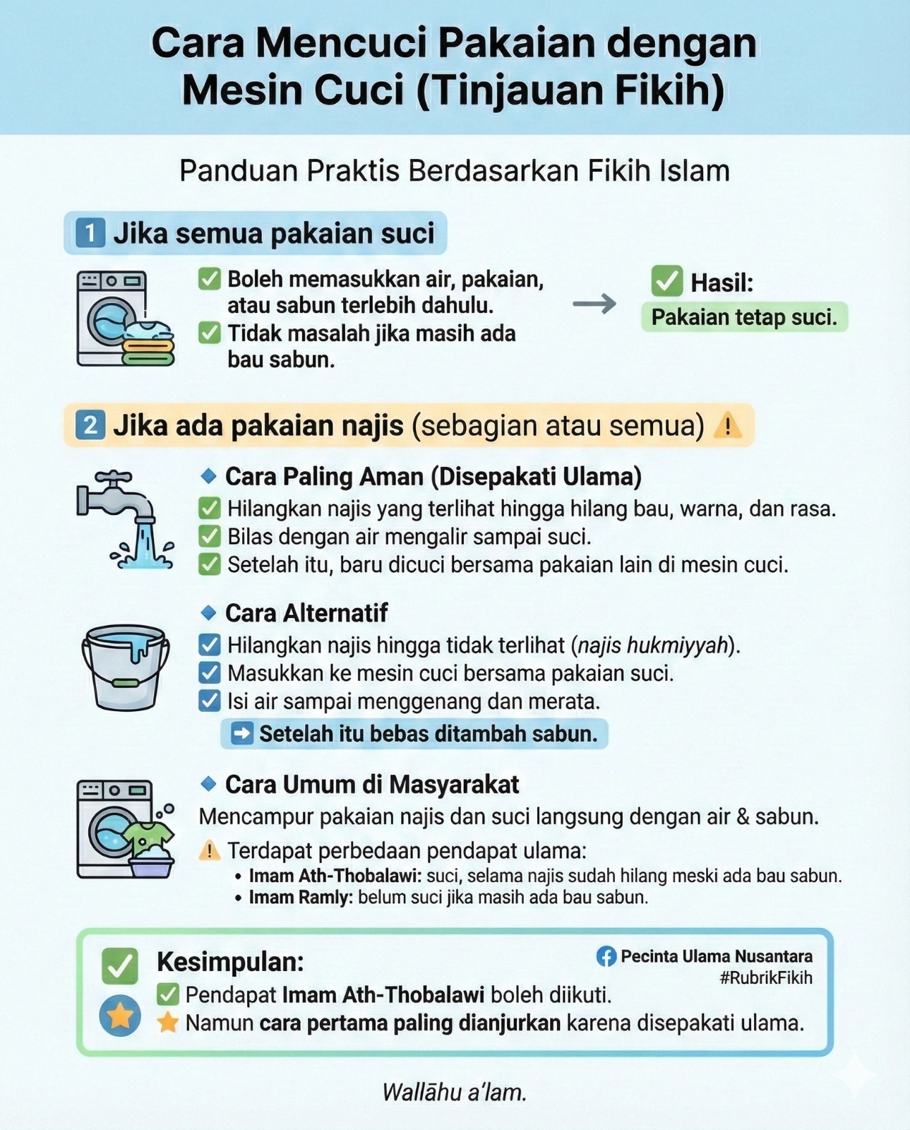 Demikian pula, tidak berpengaruh jika setelah pencucian masih tersisa bau sabun, karena seluruh pakaian dan media pencucian sejak awal berada dalam keadaan suci.